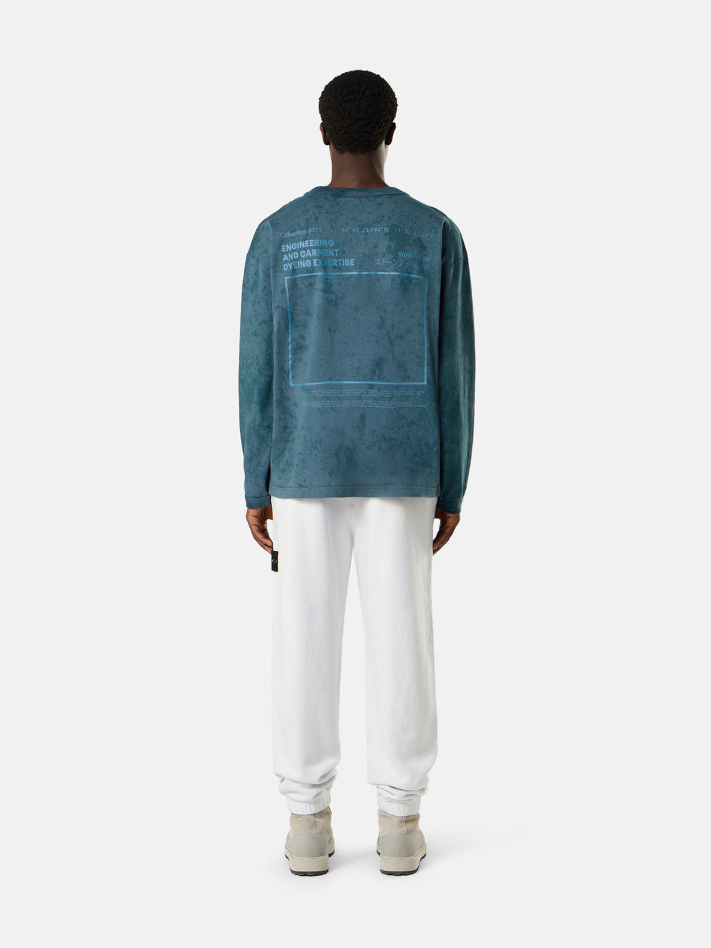 Long-sleeve T-shirt in combed organic cotton jersey with ¡®Empty Frame¡¯ print and all-over motif created using the ¡®Paintball¡¯ treatment. Inside a dyeing machine, bursts of one or more reactive gelatinous dyes are applied to the fabric, binding to the material through a special technique. The random nature of the pattern renders each garment unique and unrepeatable.