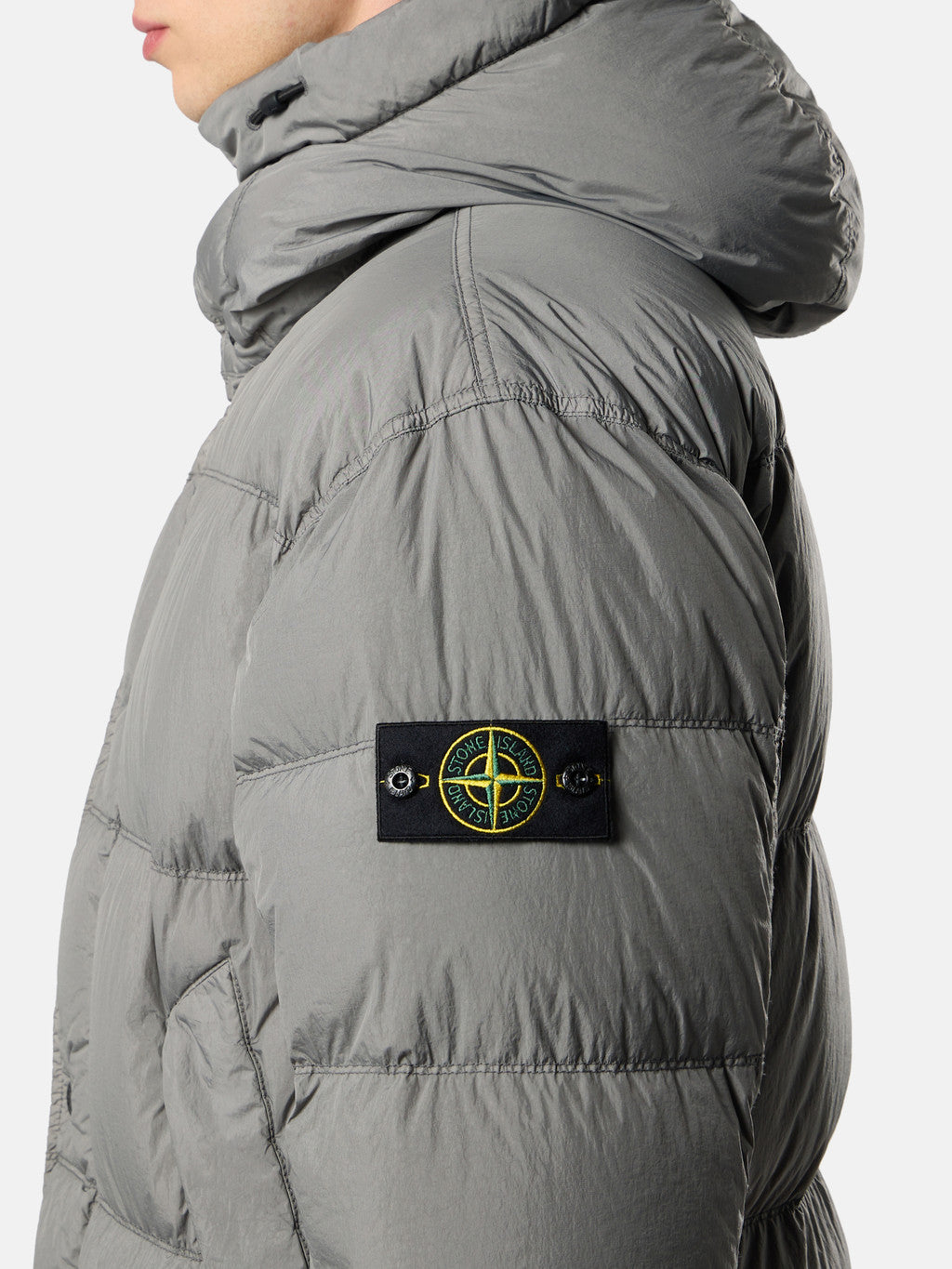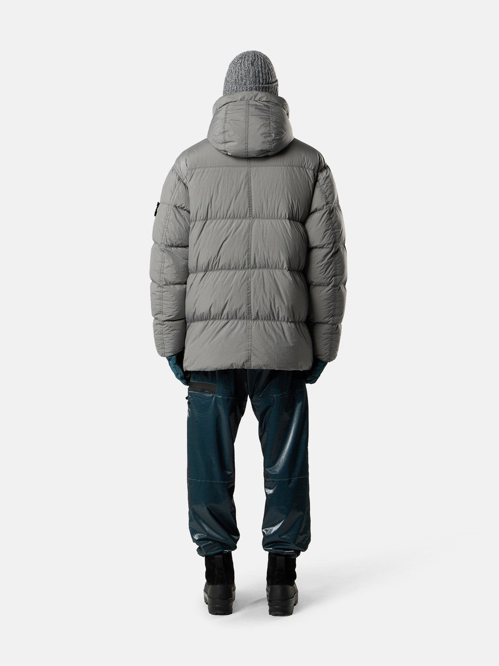 Hooded down parka in a light recycled nylon rep with an ultra-tight weaving construction. The resin coating of its inner face makes it wind resistant and mildly water resistant. Due to the resin treating of the material, the colour penetrates unevenly into the material, lending a crinkled appearance to the surface. The piece is padded with the finest feathers specifically treated to withstand the garment dyeing procedure. RDS - Responsible Down Standard certified.