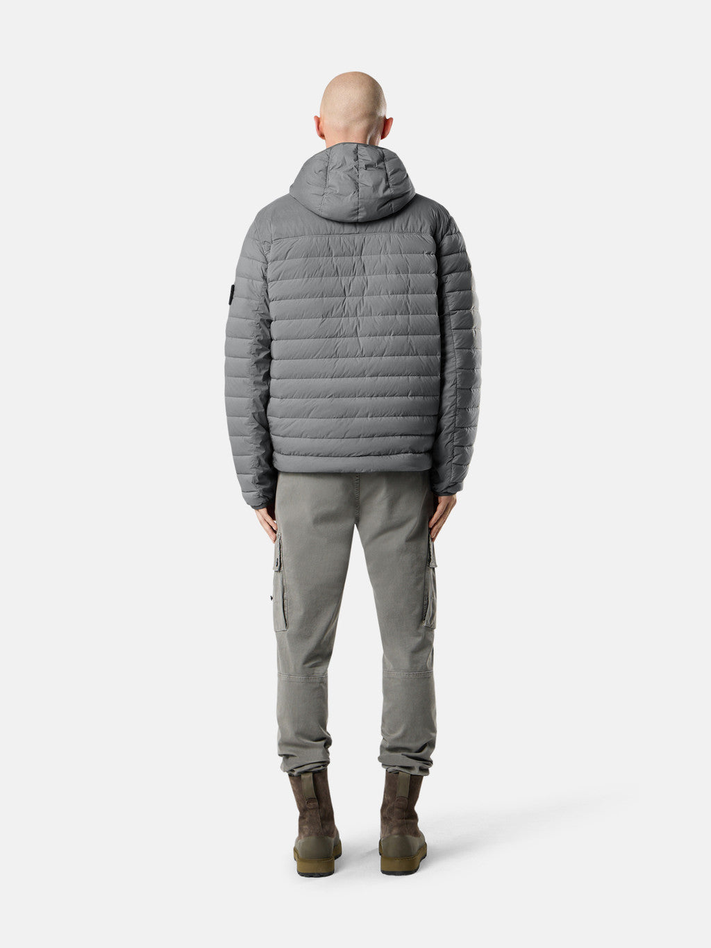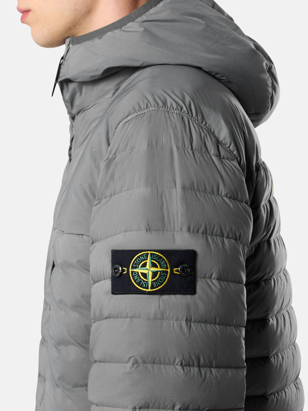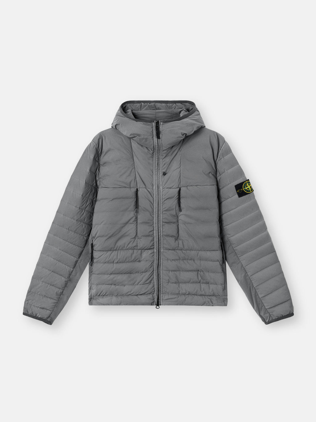 Hooded down jacket in a light single layer stretch fabric made with 86% recycled nylon that undergoes a special weaving technique automatically creating the feather compartments directly from the loom. The seamless feather tunnels substantially increase the hold of the down. The finished garment is padded with direct injection with the finest feathers, specifically treated to resist garment dyeing. Garment dyed with the addition of a special anti-drop agent. RDS - Responsible Down Standard certified.