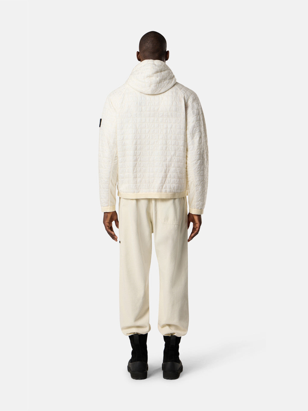 Padded hooded jacket in a light nylon rep with an ultra-tight weaving construction. The fabric features multiaxial quilting and an internal padding layer. The resin coating of its inner face makes it wind resistant and mildly water resistant. Due to the uneven penetration of colour into the resin-coated fabric, the dye bath lends a crinkled appearance to the surface. The addition of a special agent to the dye formula makes the piece anti-drop. Removable ribbed knit insert with hood.