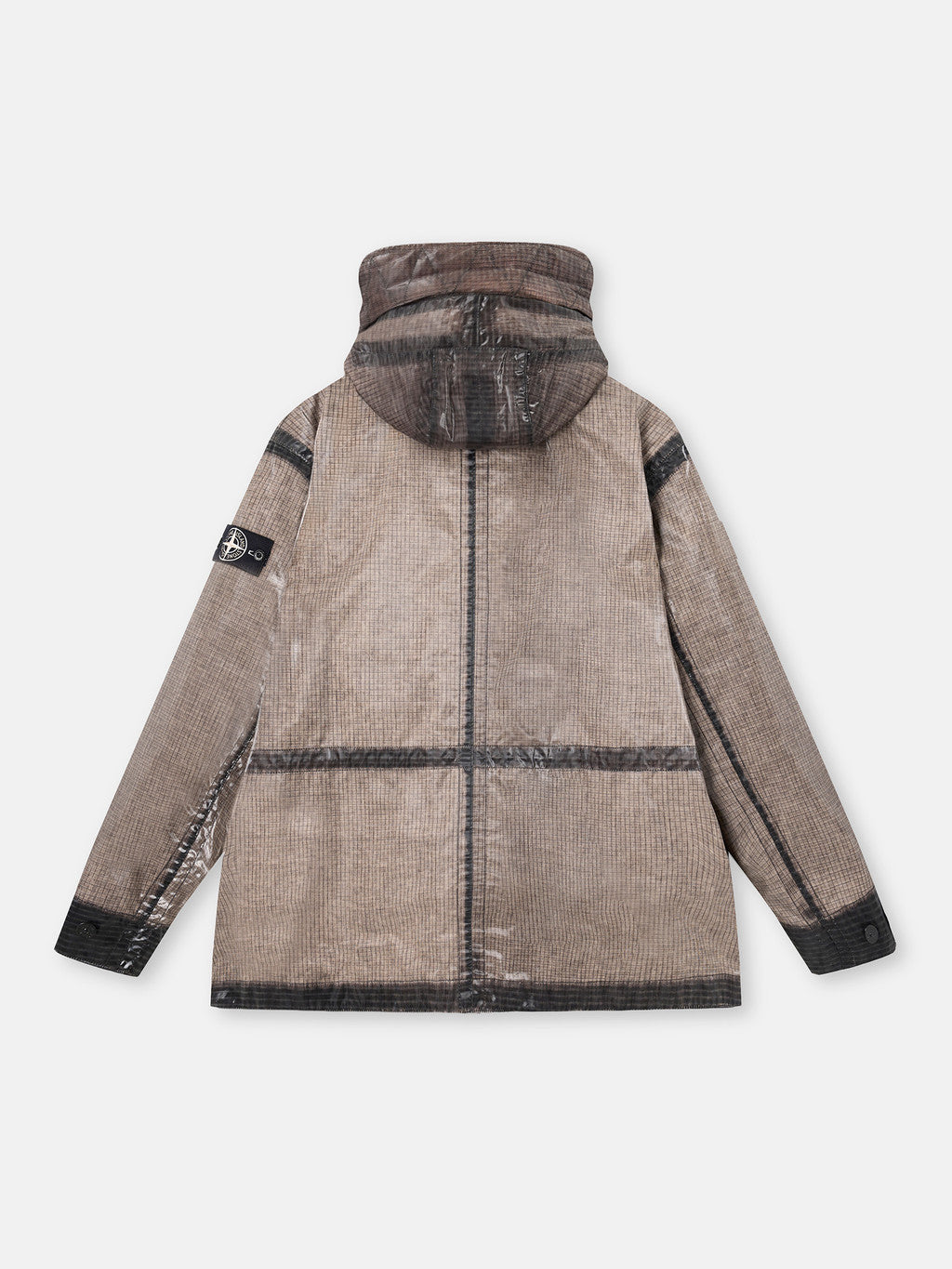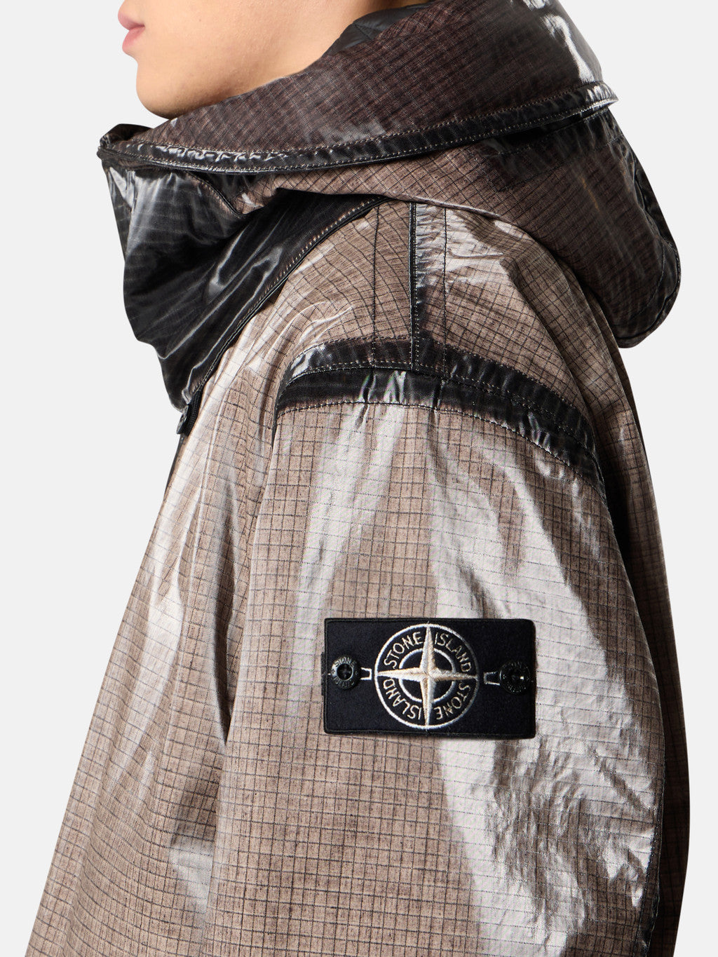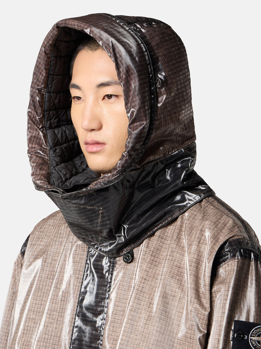 Hooded parka made from a ripstop cotton that is piece-dyed and laminated with a shiny, fine-grained polyurethane film to achieve a prismatic effect. The finished garment then undergoes a fading process, and the prismatic section is overdyed. Thanks to the construction of the garment, some parts resist fading, creating contrasting areas in a darker shade. Quilted padded lining.