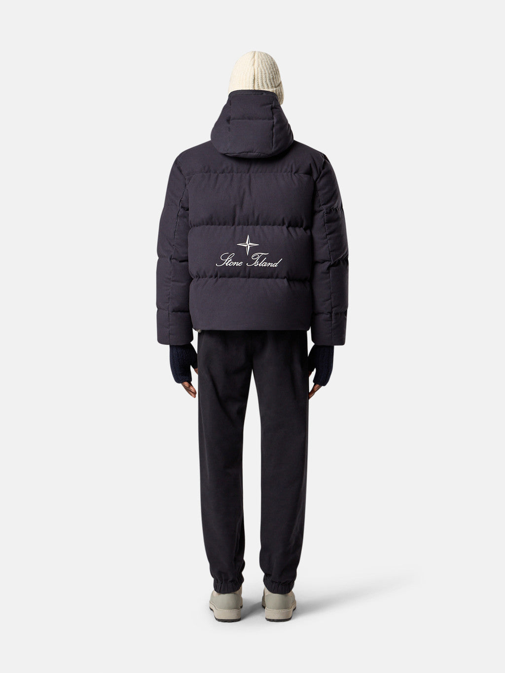 Hooded down jacket made from a cotton moleskin. The fabric's double-faced satin weave is brushed and sheared externally to achieve a warm and velvet-like hand. The fabric is resin-treated with a special anti-drop agent, making it wind resistant and mildly water resistant. RDS - Responsible Down Standard certified.