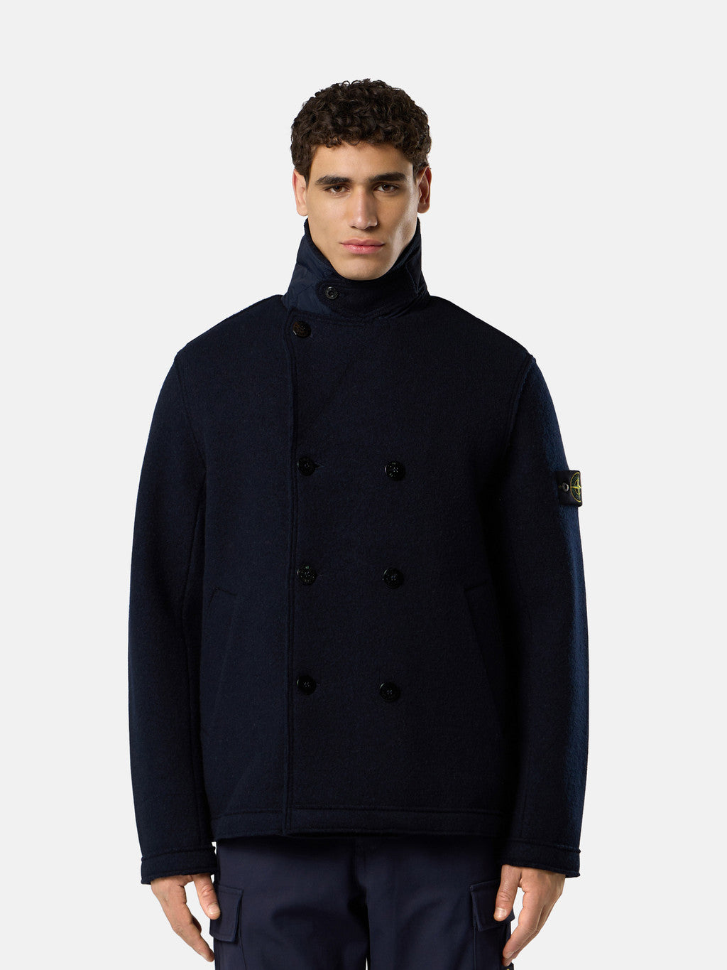Double-breasted pea coat in felted RWS wool. Gauge 5.