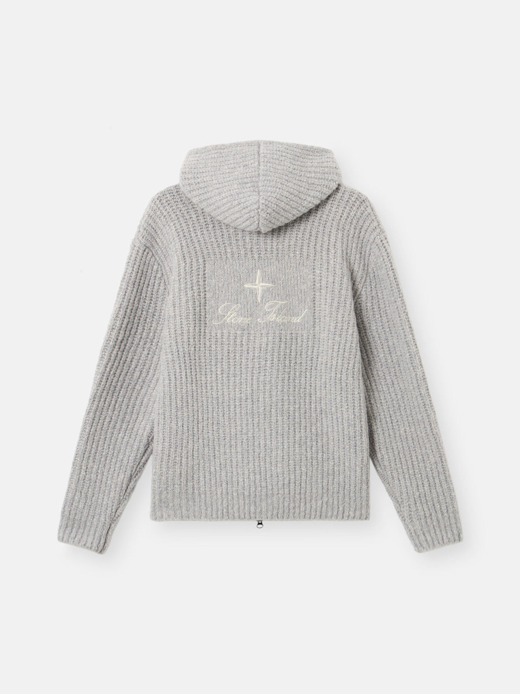 Knit hooded zip-up jumper in wool nylon BOUCLE. Fisherman's rib. Gauge 3.