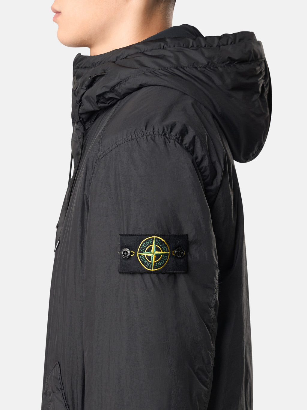 Long hooded parka in a light recycled nylon rep with an ultra-tight weaving construction. The resin coating of its inner face makes it wind resistant and mildly water resistant. Due to the resin treating of the material, the colour penetrates unevenly into the material, lending a crinkled appearance to the surface. Padded with PrimaLoft -TC, an exclusive blend of high-performance insulating fibres, 70% recycled, engineered with Stone Island for garment dyeing. Garment dyed with the addition of a special anti-drop agent.