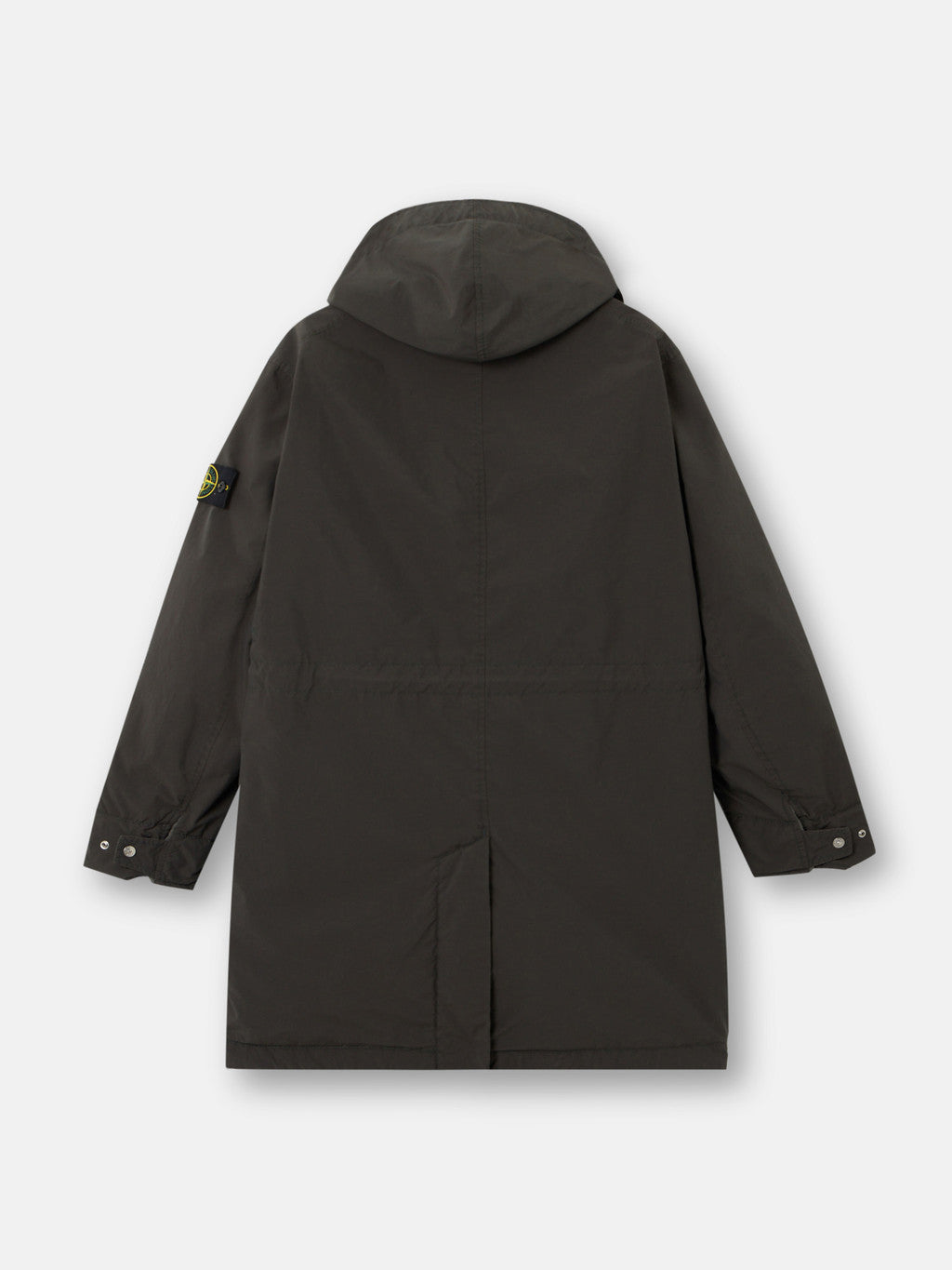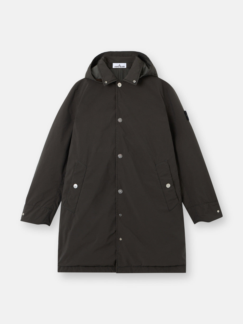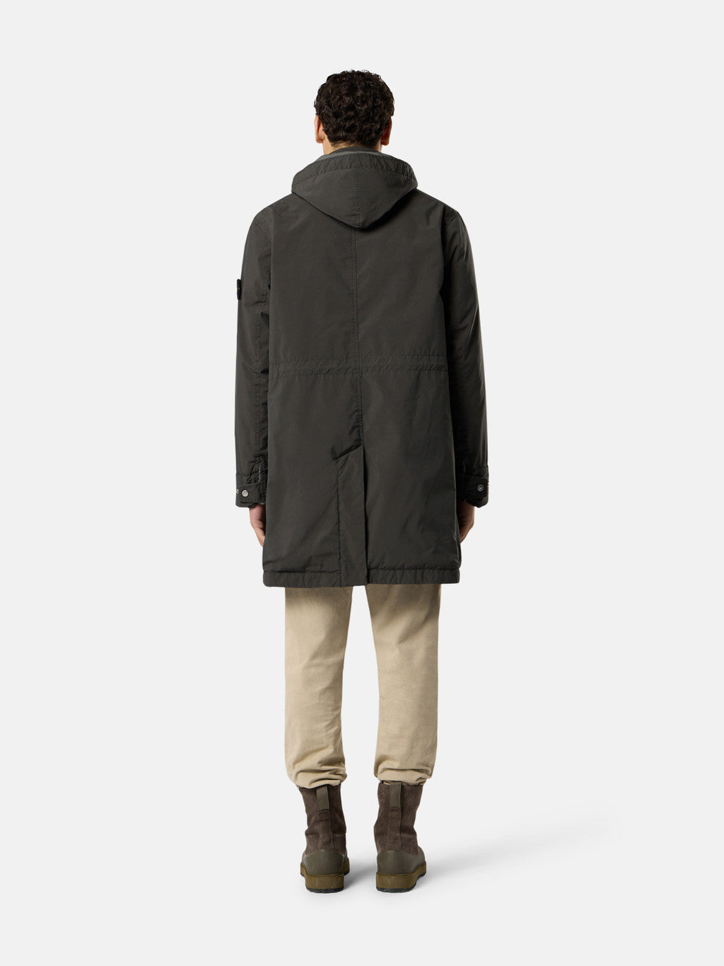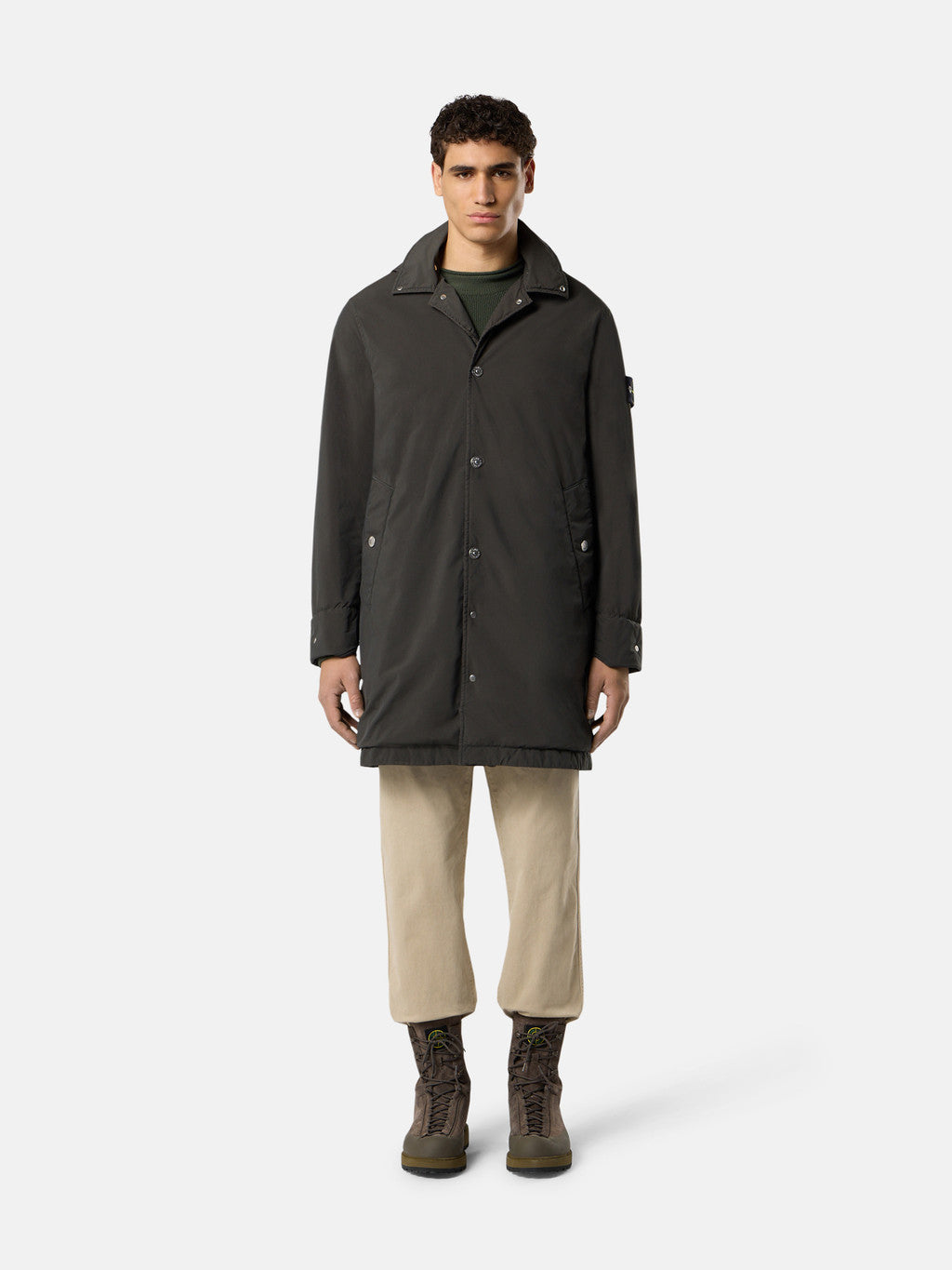 Long hooded parka made from a lightweight canvas with 60% recycled polyester, featuring a super matt appearance and a cotton-like hand. The fabric compacts and takes on its final appearance through the garment dyeing procedure at 130¡ã under pressure. The addition of a special agent to the dye recipe makes the garment anti-drop. Padded lining.