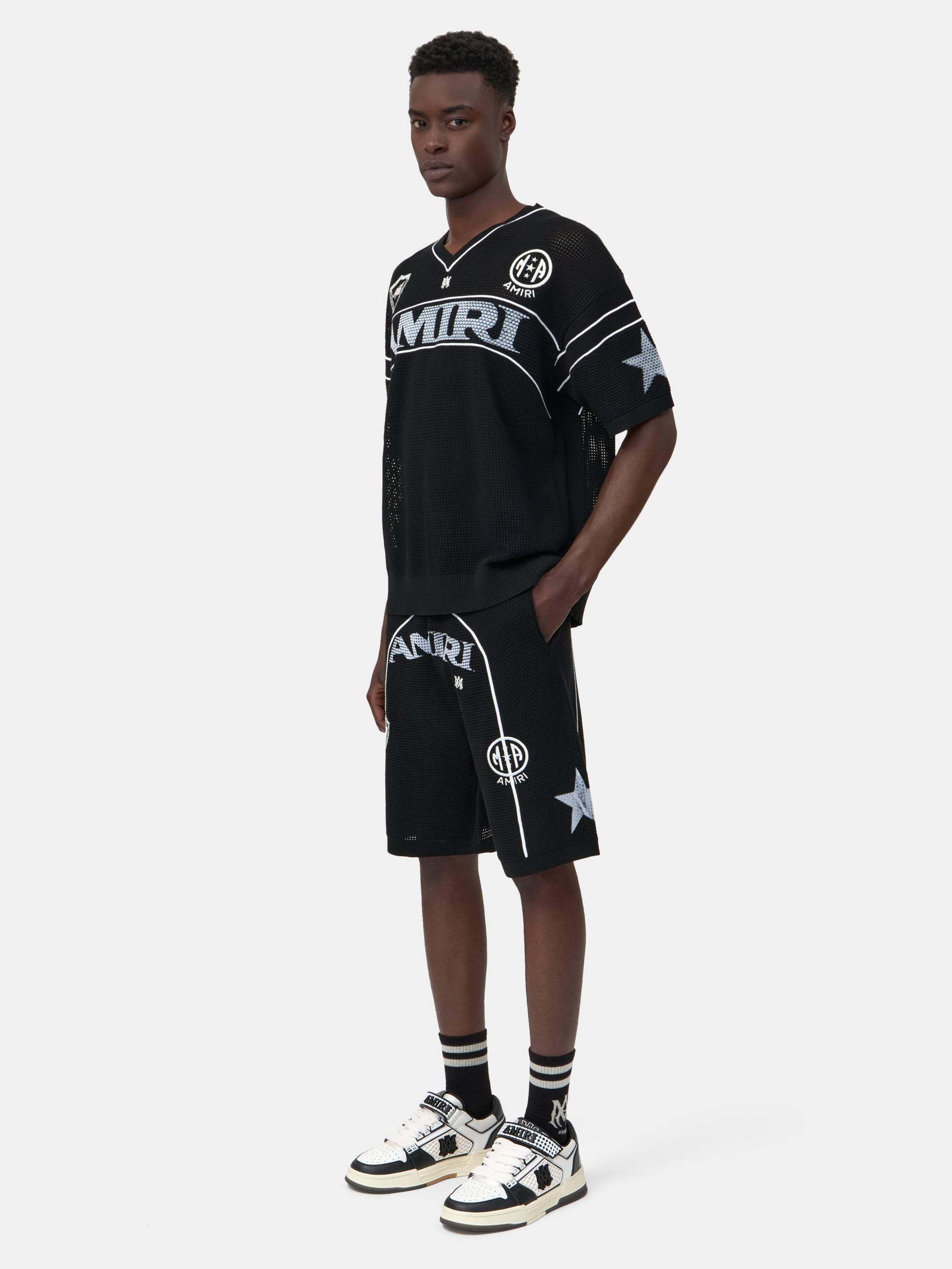 For Pre-Spring 2026, mesh jerseys with languid fits capture the effortless attitude of the off-duty athlete. The AMIRI Sport Jersey is embroidered with seasonal logo graphics and finished with contrast piping and fine rib detailing.