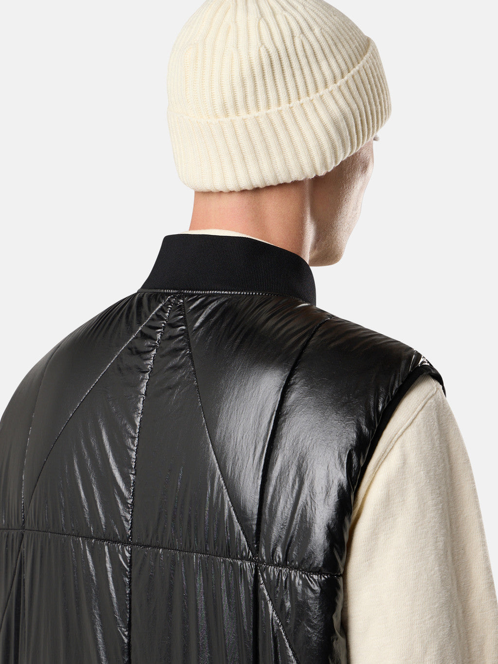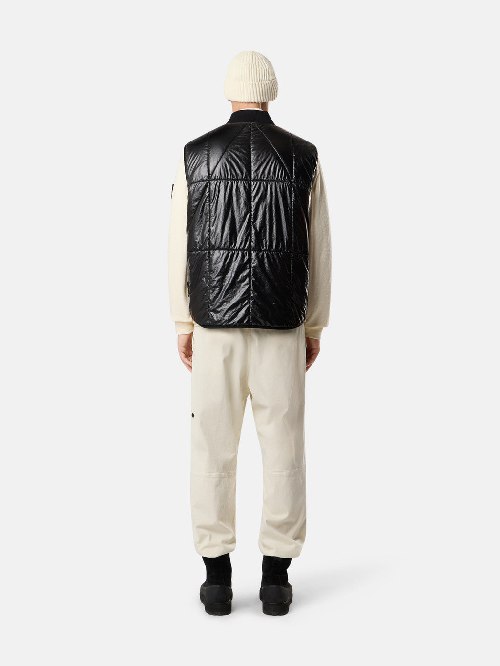 Reversible garment. On one side, compact jersey composed of mako cotton and nylon and on the other, nylon coated with a glossy polyurethane resin. Garment dyed with a double colour recipe.