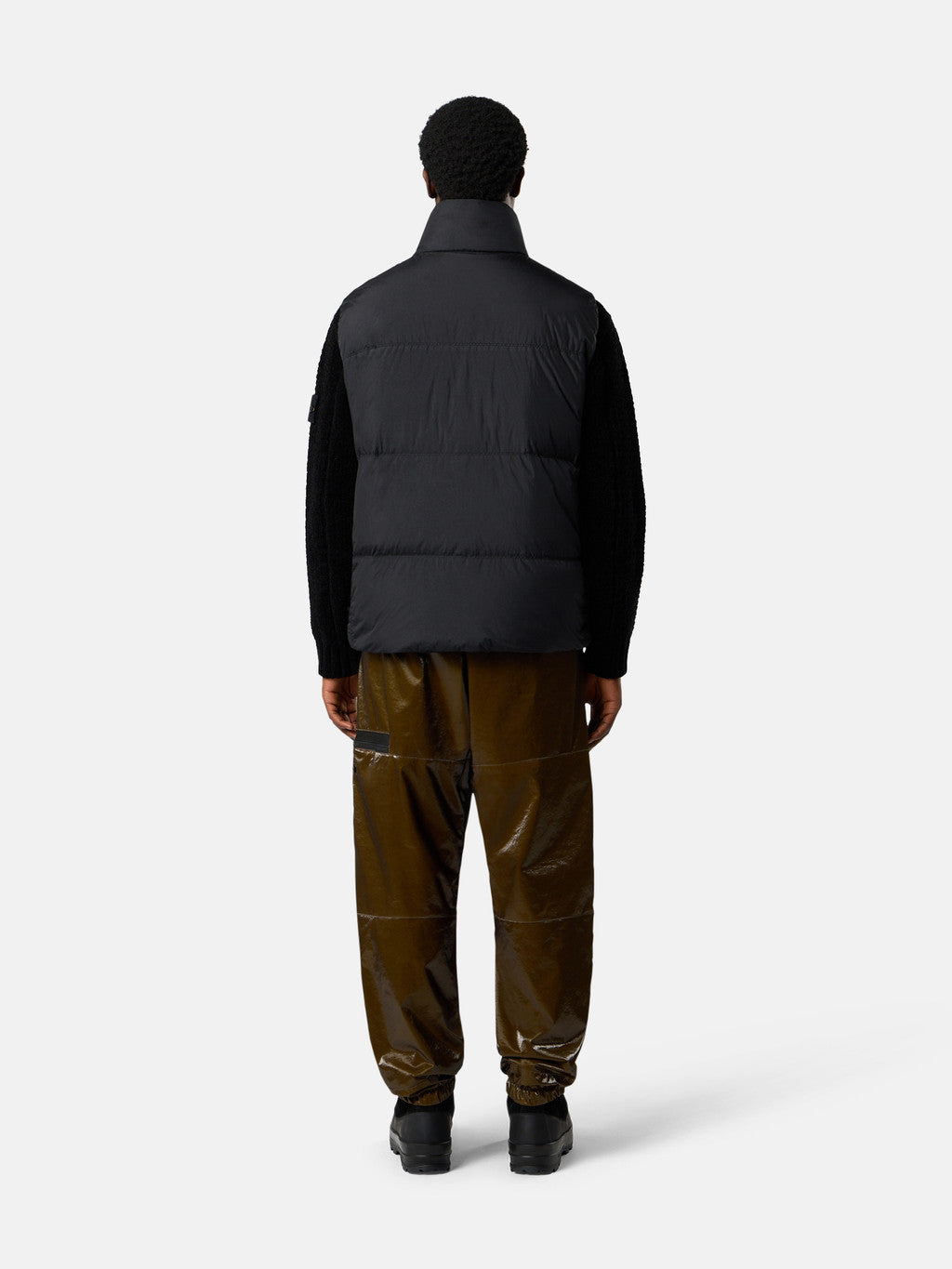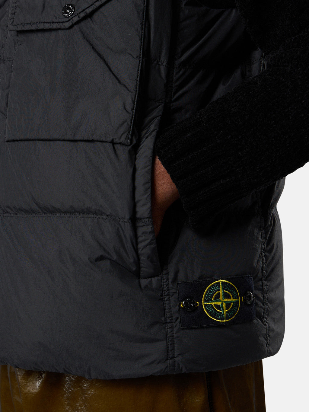 Down vest in a 100% recycled light nylon rep with an ultra-tight weaving construction. The resin coating of its inner face makes it wind resistant and mildly water resistant. The finished piece has been filled with the finest down specifically treated to withstand the garment dyeing procedure. Extra lightness and comfort are achieved through the direct injection of the feathers and by a simplified construction of the down bags. Due to the resin treating of the material, the colour penetrates unevenly into the material, lending a crinkle aspect to the surface. The addition of a special PFC free agent to the dye formula makes the piece anti-drop. RDS - Responsible Down Standard certified.