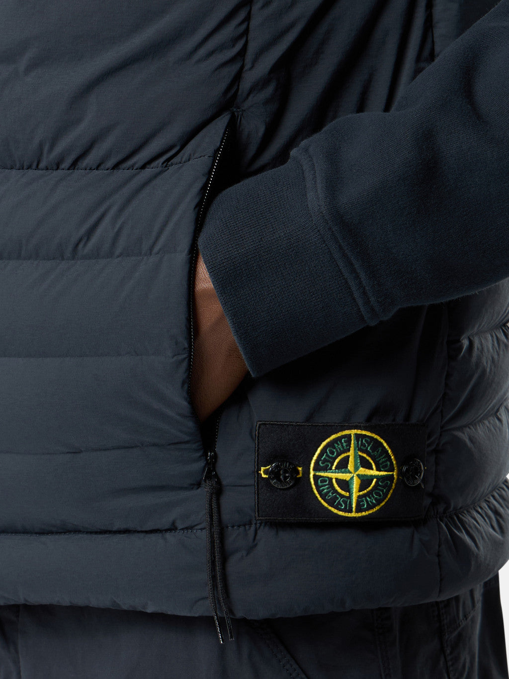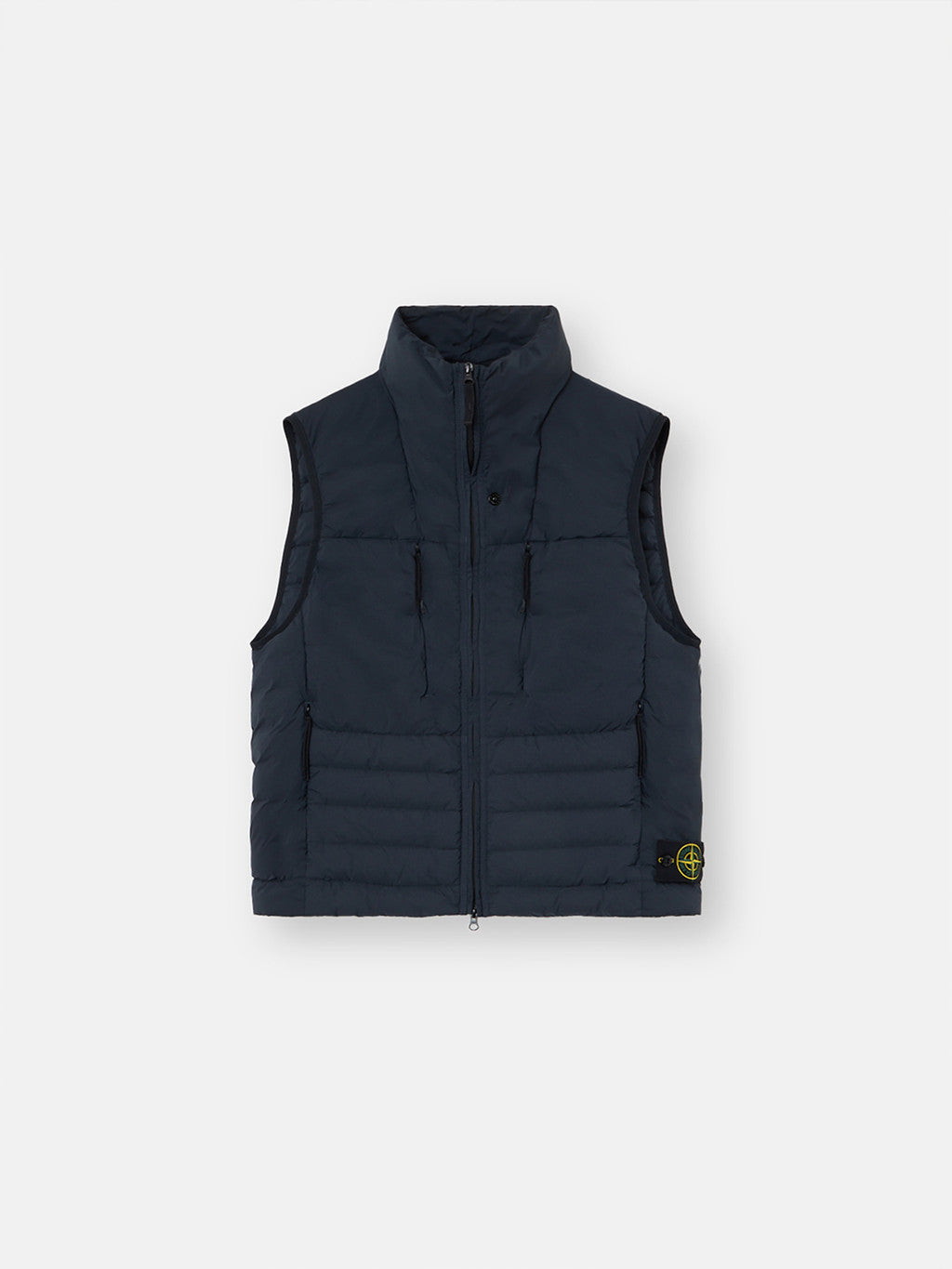 Down vest in a light stretch nylon single layer fabric undergoing a special weaving technique automatically creating the feather compartments directly from the loom. The seamless feather tunnels substantially increase the hold of the down. The finished garment is padded with direct injection with the finest feathers, specifically treated to resist garment dyeing. Garment dyed with the addition of a special anti-drop agent. RDS - Responsible Down Standard certified.