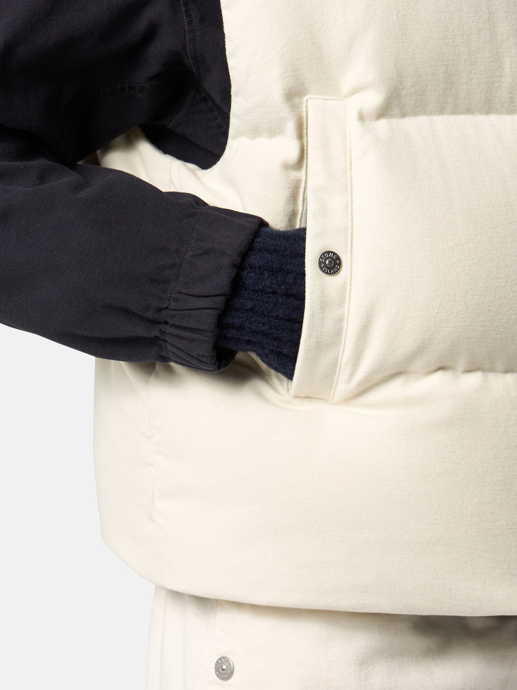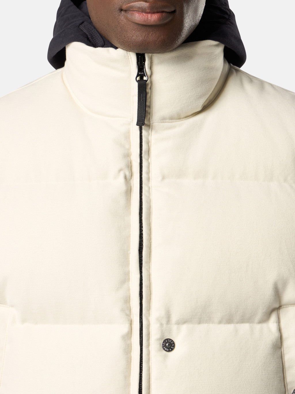 Down vest made from a cotton moleskin. The fabric's double-faced satin weave is brushed and sheared externally to achieve a warm and velvet-like hand. The fabric is resin-treated with a special anti-drop agent, making it wind resistant and mildly water resistant. RDS - Responsible Down Standard certified.